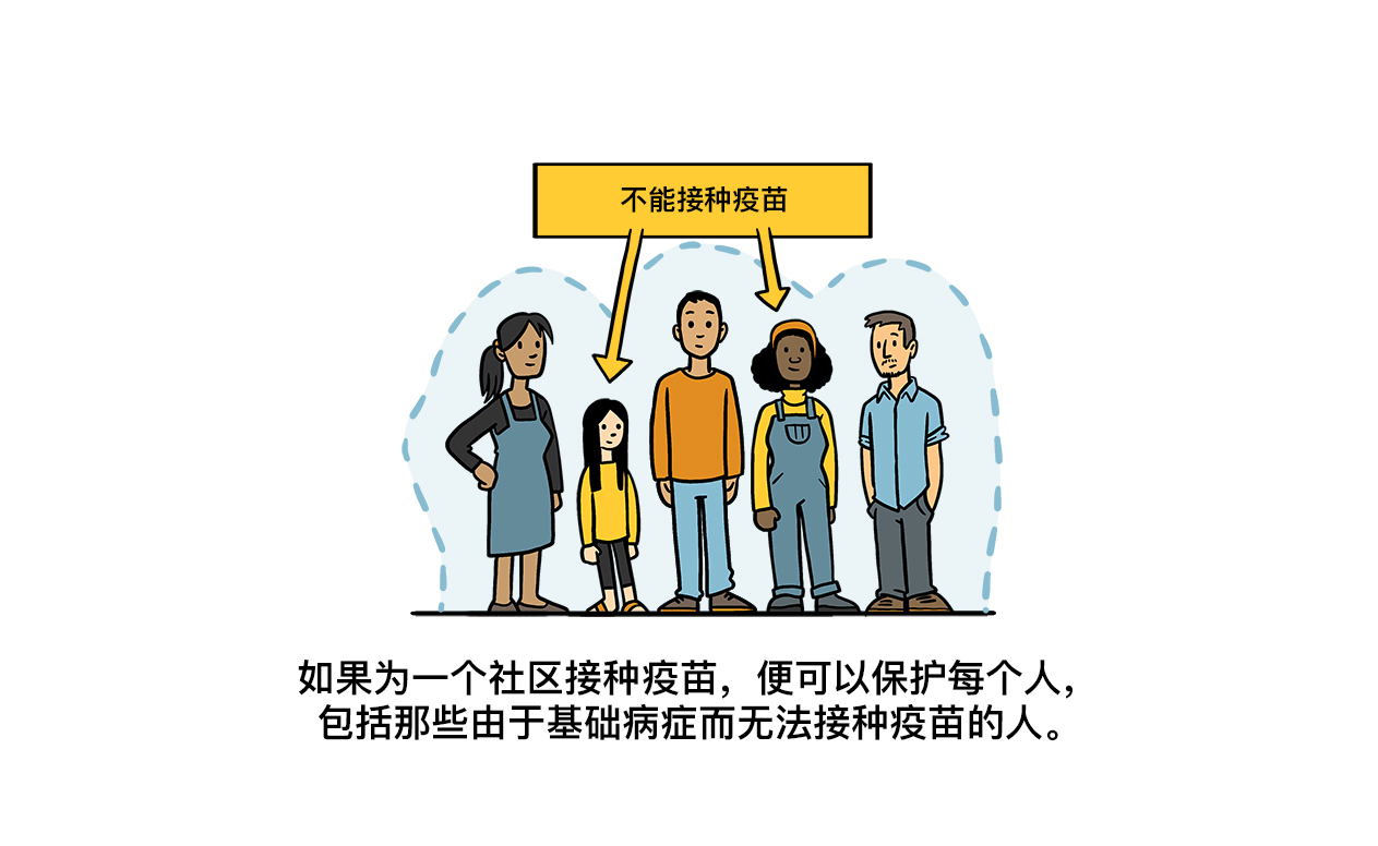 人在接种疫苗后,很可能会预防目标疾病。但不是每个人都能接种疫苗。患有基础病(如癌症或艾滋病)削弱其免疫系统的人或对某些疫苗成分严重过敏的人可能无法接种某些疫苗。如果这些人生活在接种过疫苗的人群中,他们仍然可以受到保护。